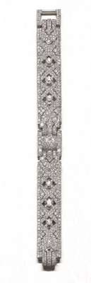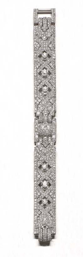 of geometric design, composed of two long rectangular diaper pierced panels flanking the central smaller hinged panel, pave set throughout with early brilliant, old European and single cut diamonds, with concealed clasp and French control marks, additionally numbered 5287C