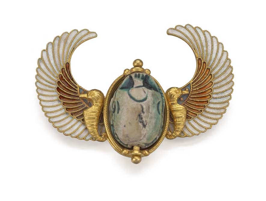 the central scarab flanked by stylised birds against curved wings, enamel decorated in shades of white, brown and blue