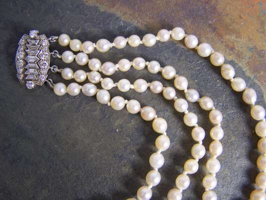 composed of graduated pearls ranging from 4.5mm to 8mm diameter, the shaped oval clasp collet set to the centre with a hexagonal cut diamond, flanked to either side with three graduated trapezoid cut diamonds, within a surround of graduated round brilliant cut diamonds, stamped YARD