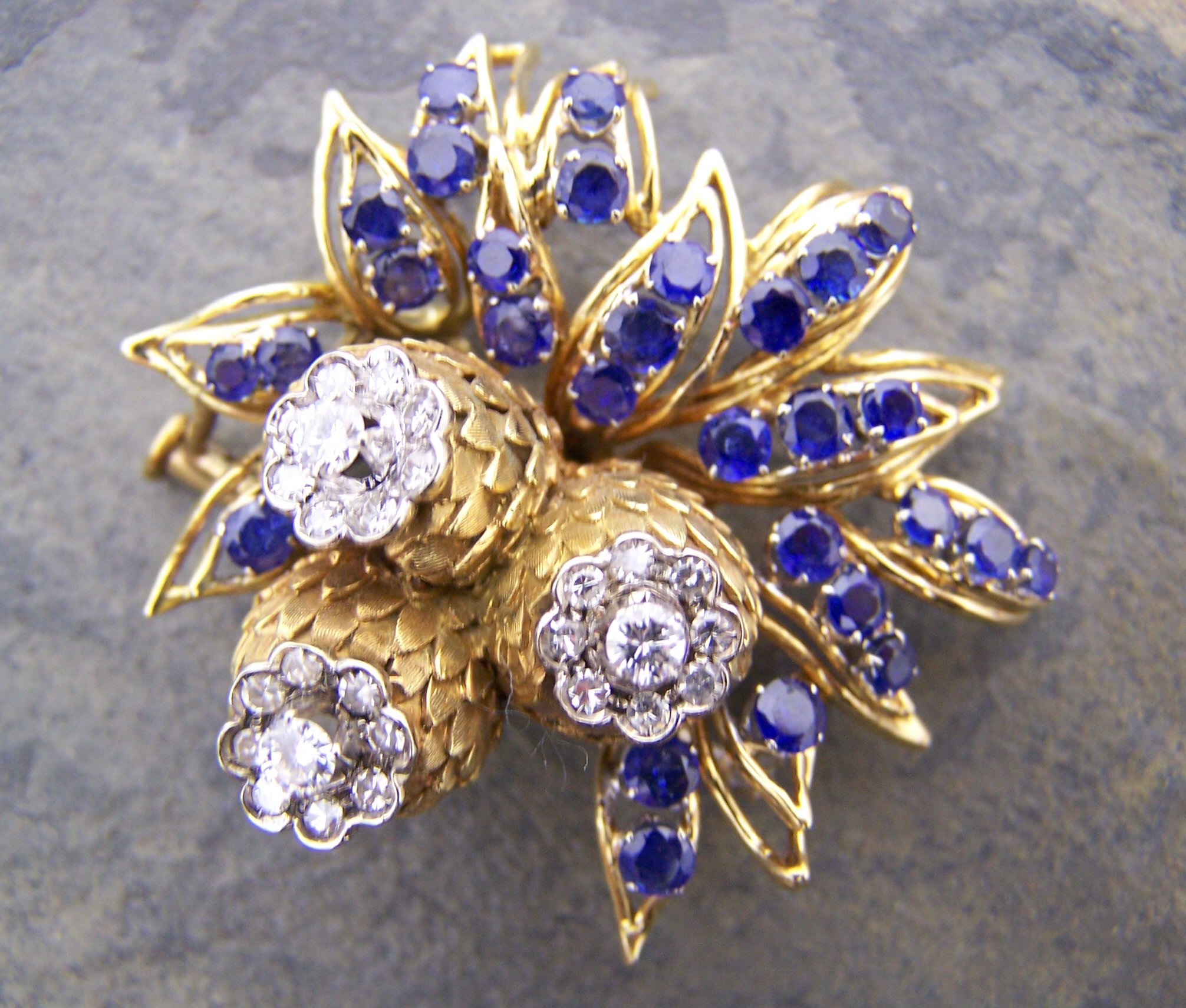 composed of three stylised flowerheads each with central diamond set floral cluster, flanked by a spray of foliage set with graduated circular cut sapphires, stamped 18K