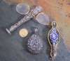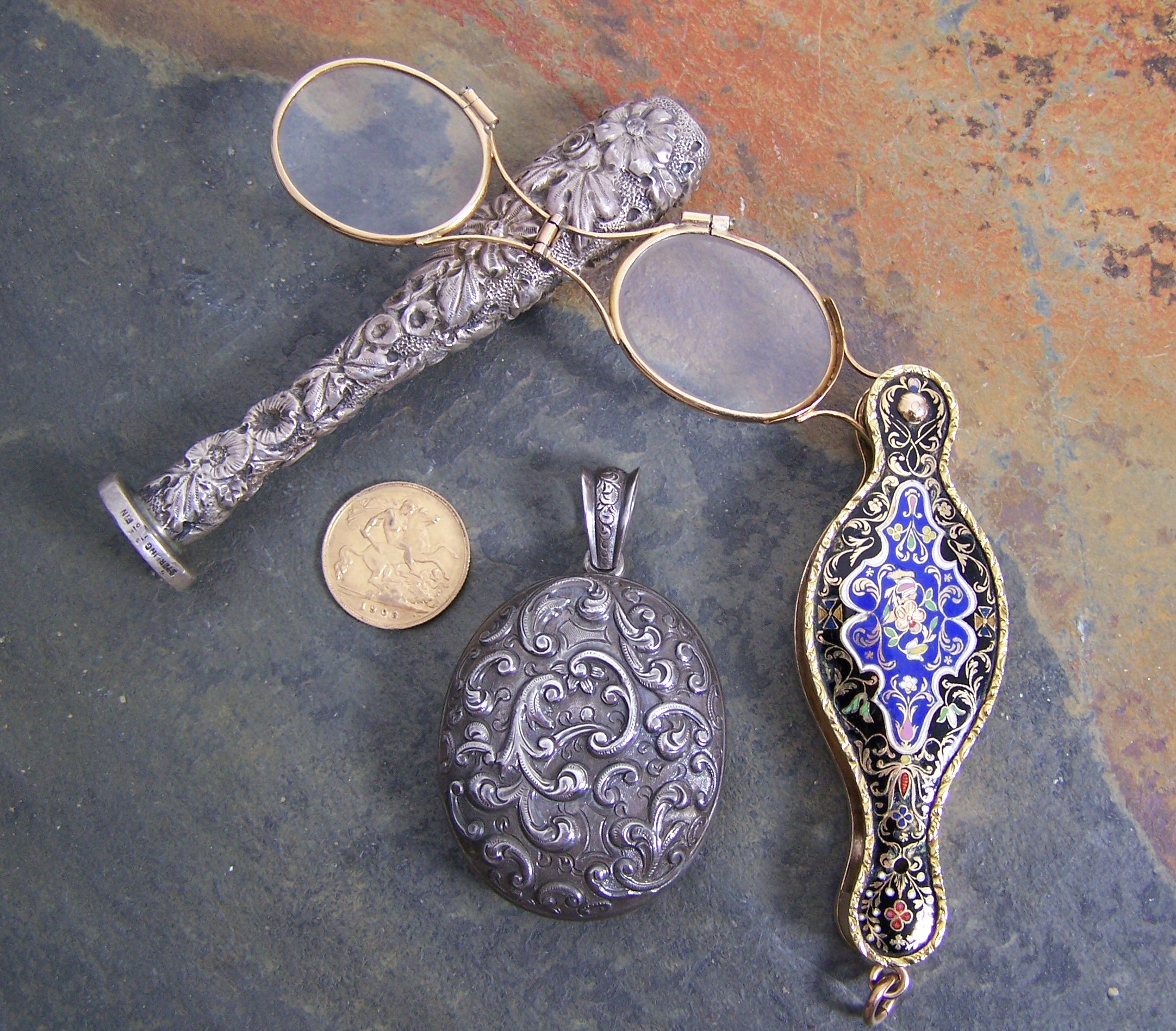 to include a pair of enamel decorated folding lorgnettes; an initialled fob seal with foliate cast tapered grip, stamped Sterling; an oval white metal locket decorated with foliate scrolls, containing a miniature portrait of a baby and a lock of hair; together with an Edward VII Half-Sovereign, 1908 (4)