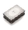 with marks for Birmingham 1859, maker Edward Smith, of shaped rectangular outline, engraved with strapwork style scrolls, the hinged cover with foliate thumb-piece and inscribed initial A beneath a crown, with gilt interior
