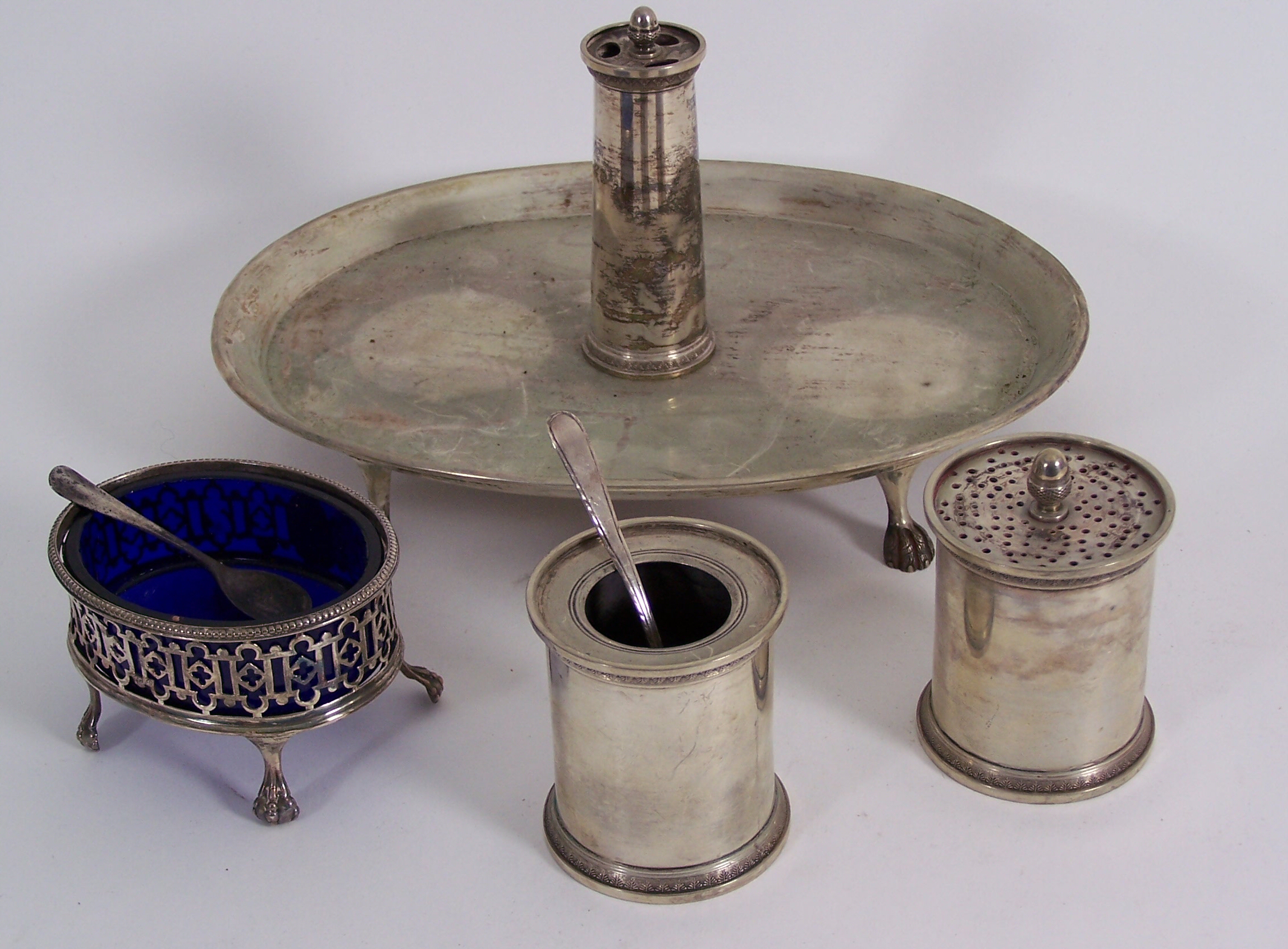 including an oval dish with central spill; a pepper pot and mustard; together with a George III style oval salt, with pierced sides and liner (4)