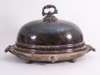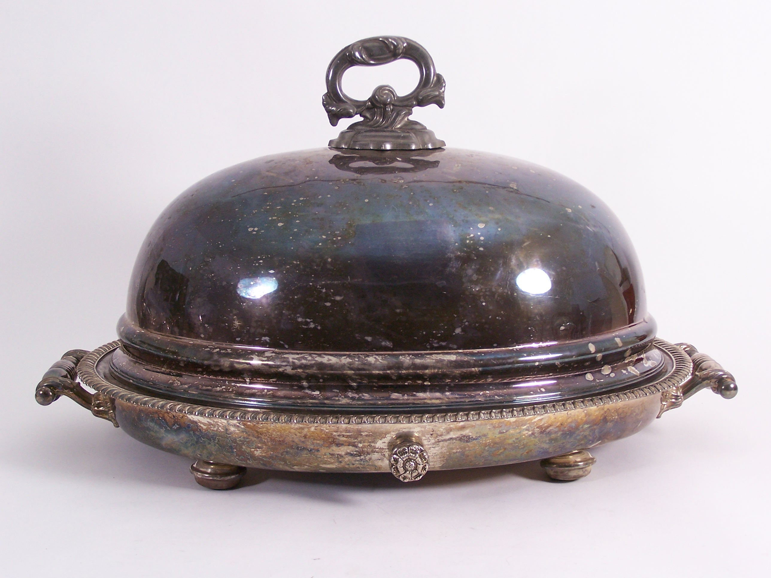 of oval outline with gadrooned edge flanked by scroll handles and raised on four bun feet, the high domed cover with central leaf capped scroll handle