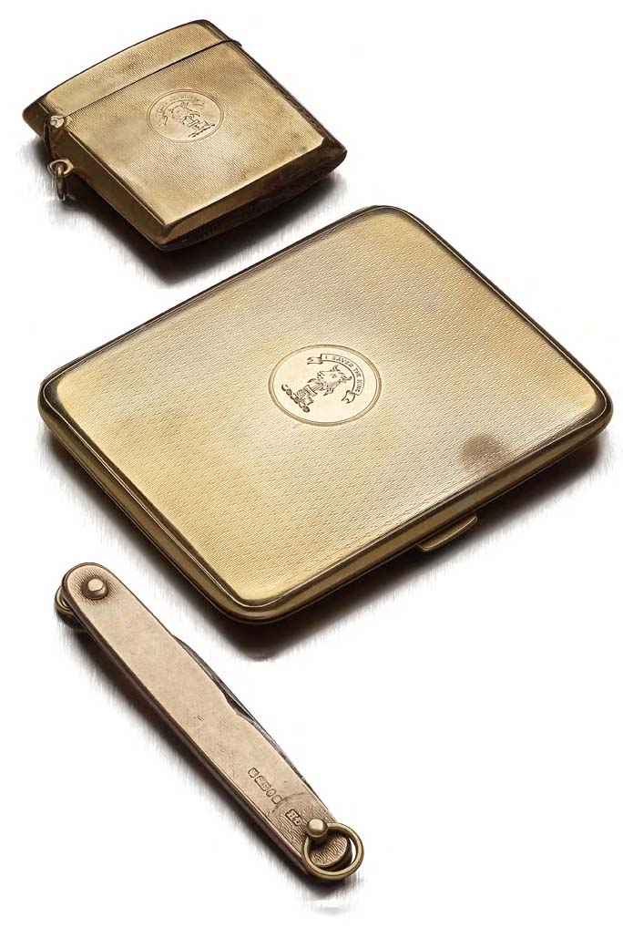 of slim rectangular form, crested and inscribed I SAVED THE KING; a matching 9ct gold engine turned cigarette case, also crested and inscribed; together with a 9ct rose gold folding knife (3)