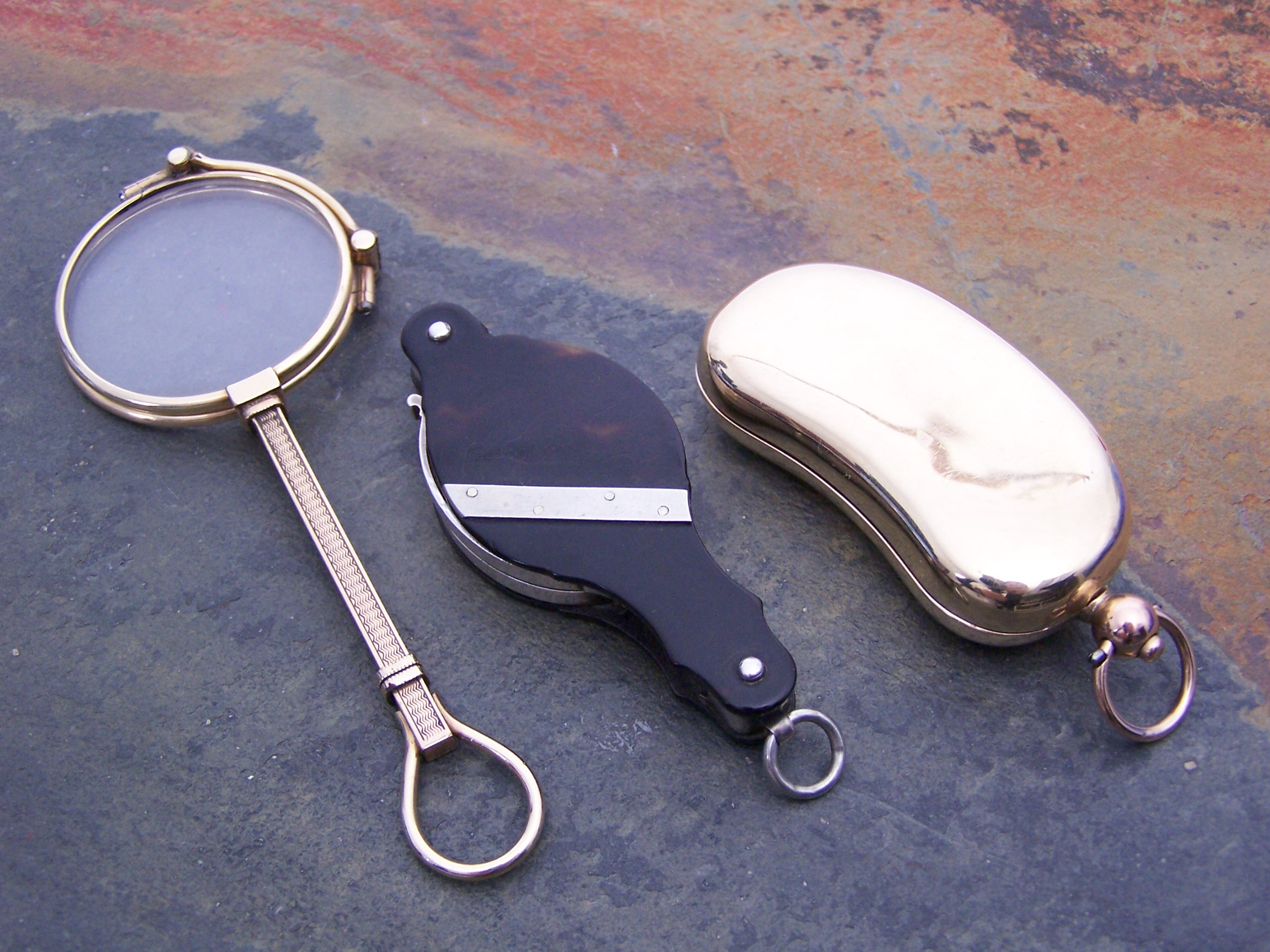 of curved rectangular form, with hinged cover and suspension ring; a pair of tortoiseshell mounted folding lorgnettes; together with another engine turned gilt metal pair (3)