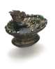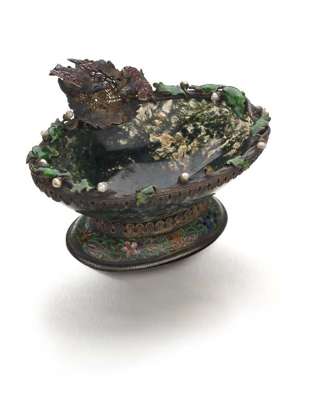of oval outline, on foliate scroll engraved and polychrome enamel decorated pedestal foot, the white metal mounted rim overlaid with green enamelled oak leaves interspersed with seed pearls and applied to one side with a nest surmounted by two birds, decorated with blue enamel with red stone set wings (likely to be rubies)