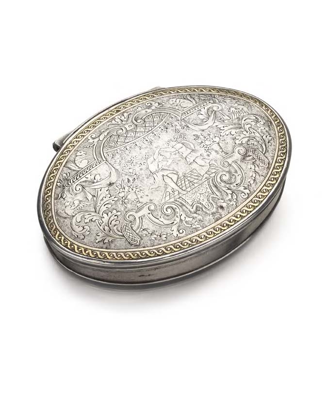 apparently unmarked, the hinged cover engraved with dancing figures amidst Renaissance motifs within a scroll border