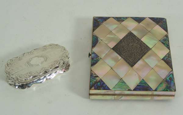 with marks for Birmingham 1849, maker's mark F&Co, of shaped oval outline, variously bright engraved within a foliate scroll border, with central vacant cartouche and scroll cast thumb-piece; together with a card case applied with mother of pearl panels (2)