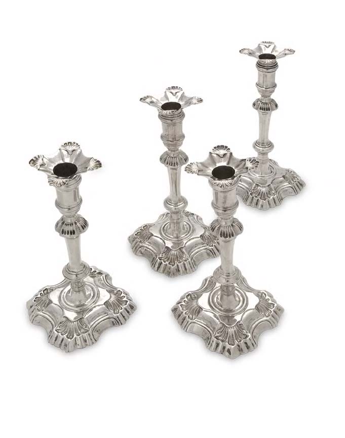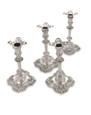 in the George II style, each with shaped square base beneath a knopped tapered column and cylindrical capital with matching shaped square sconces (4)