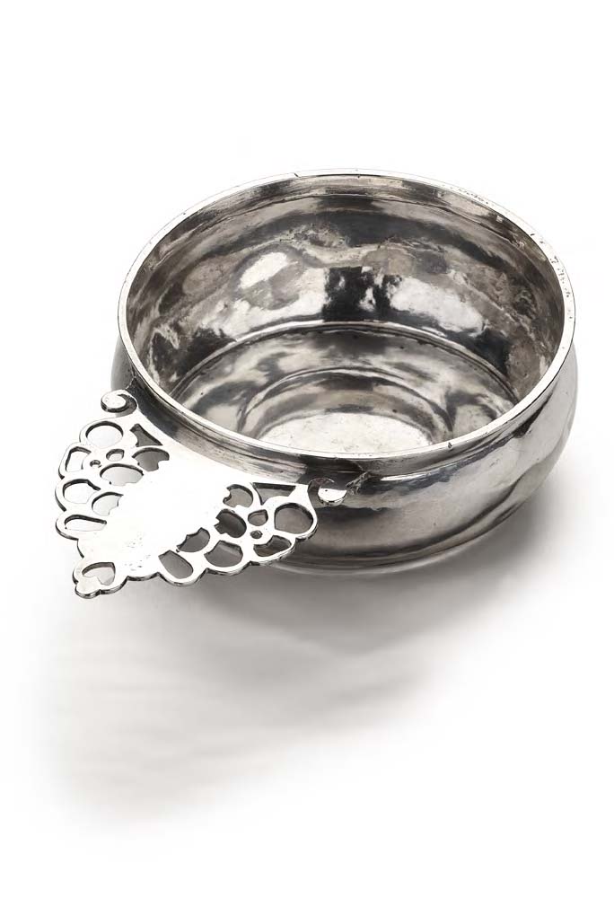 with marker's mark struck twice, attributed to John Hull of Boston Massachusetts working 1624-1683, of circular bellied form, with pierced flat handle and slightly dished base