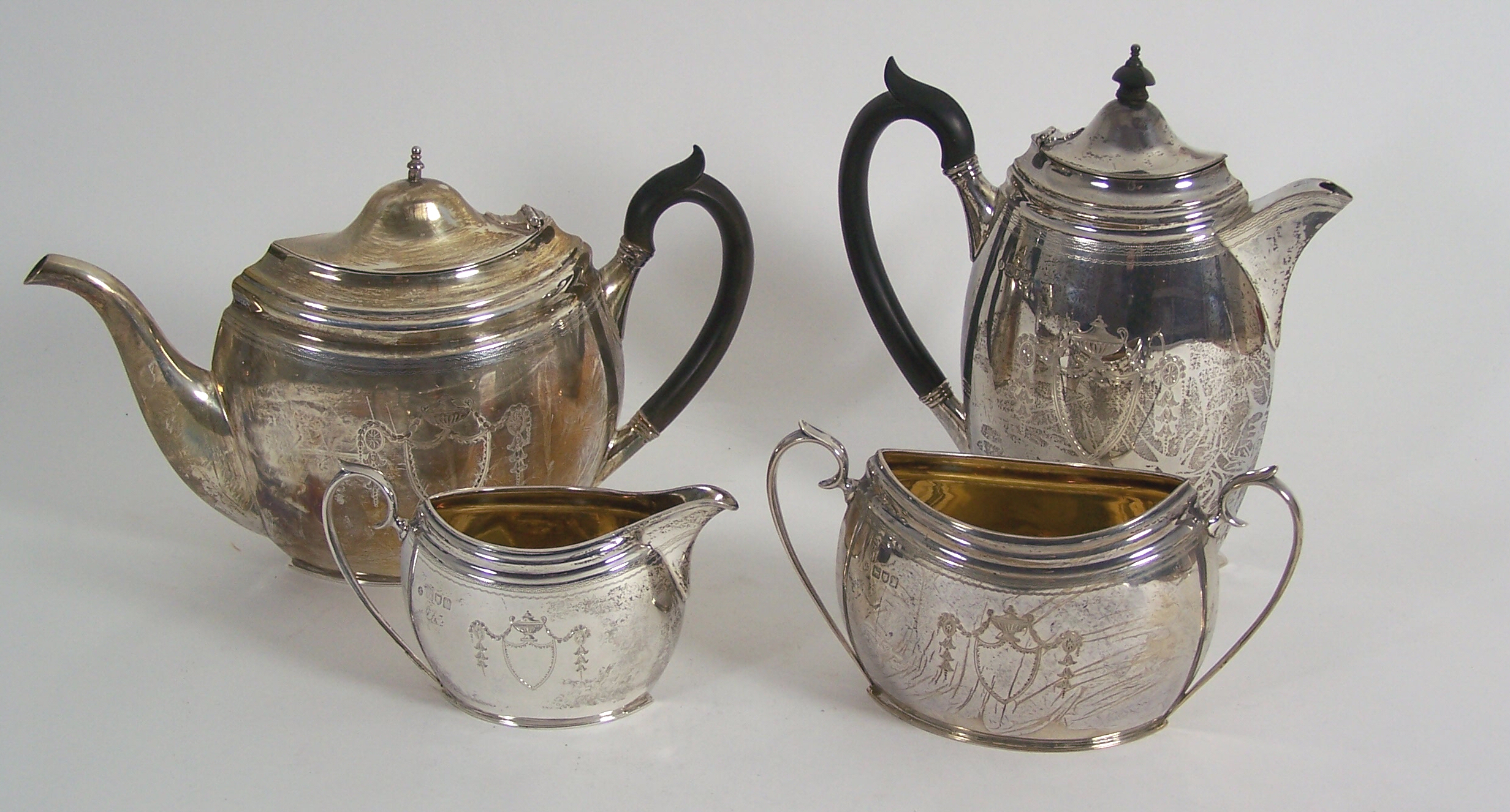 with marks for London 1912, maker Edward Barnard & Sons Ltd, comprising teapot, hot water pot, twin-handled sugar bowl and milk jug, each of slim oval outline engraved with Adam style decoration (4)