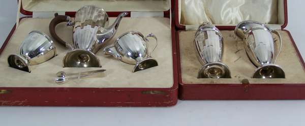 with marks for Birmingham 1927, maker Robert Stewart, comprising coffee pot, matching sugar bowl and cream jug each of panelled tapered cylindrical form on pedestal foot, with matched sugar tongs, contained in a fitted case; together with a matching cased sugar caster and cream jug, same date and maker (2)