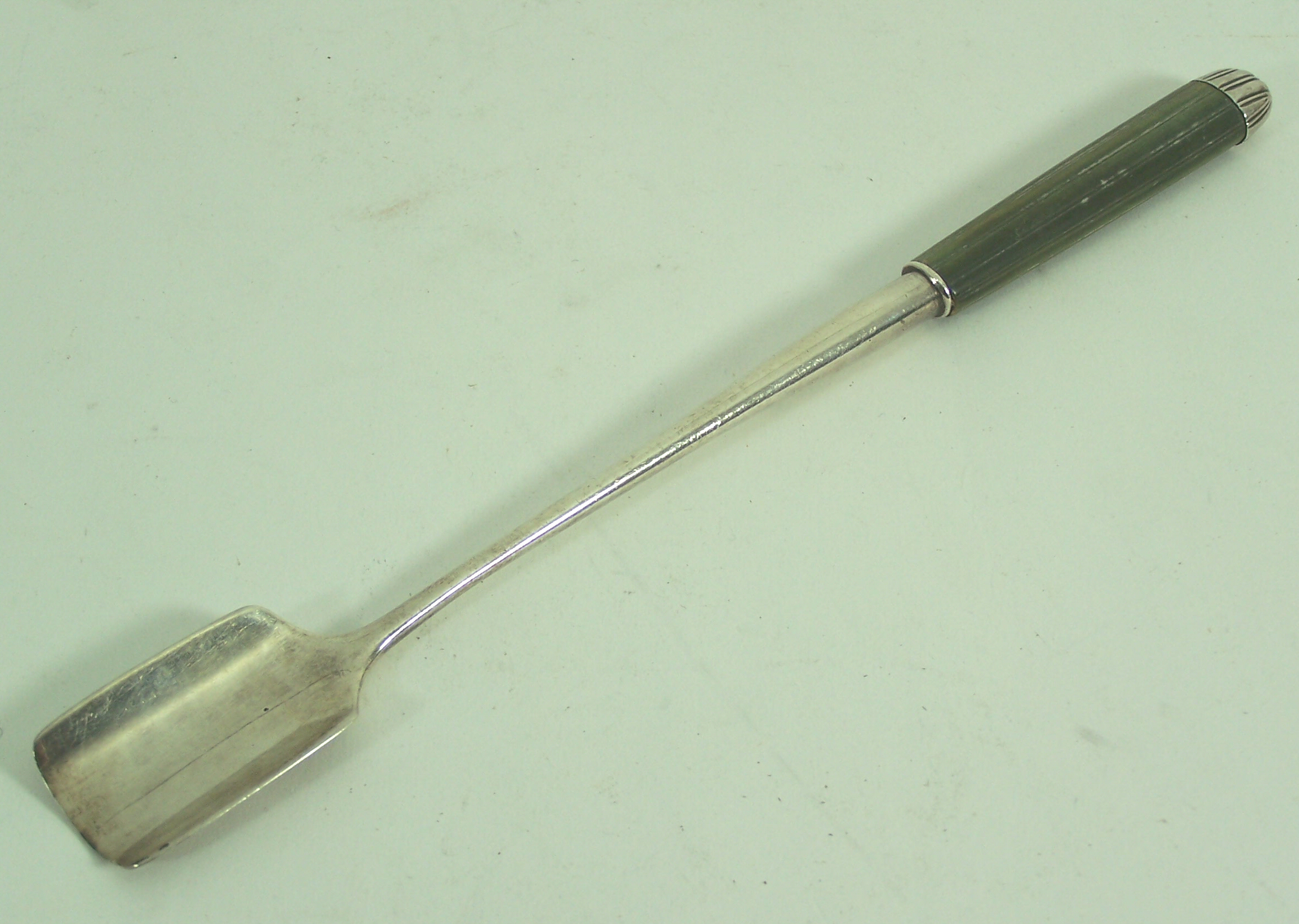 with marks for London 1787, maker George Smith and William Fearn, with ribbed stained green ivory handle and ribbed knop, the scoop with engraved crest and motto to the back