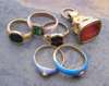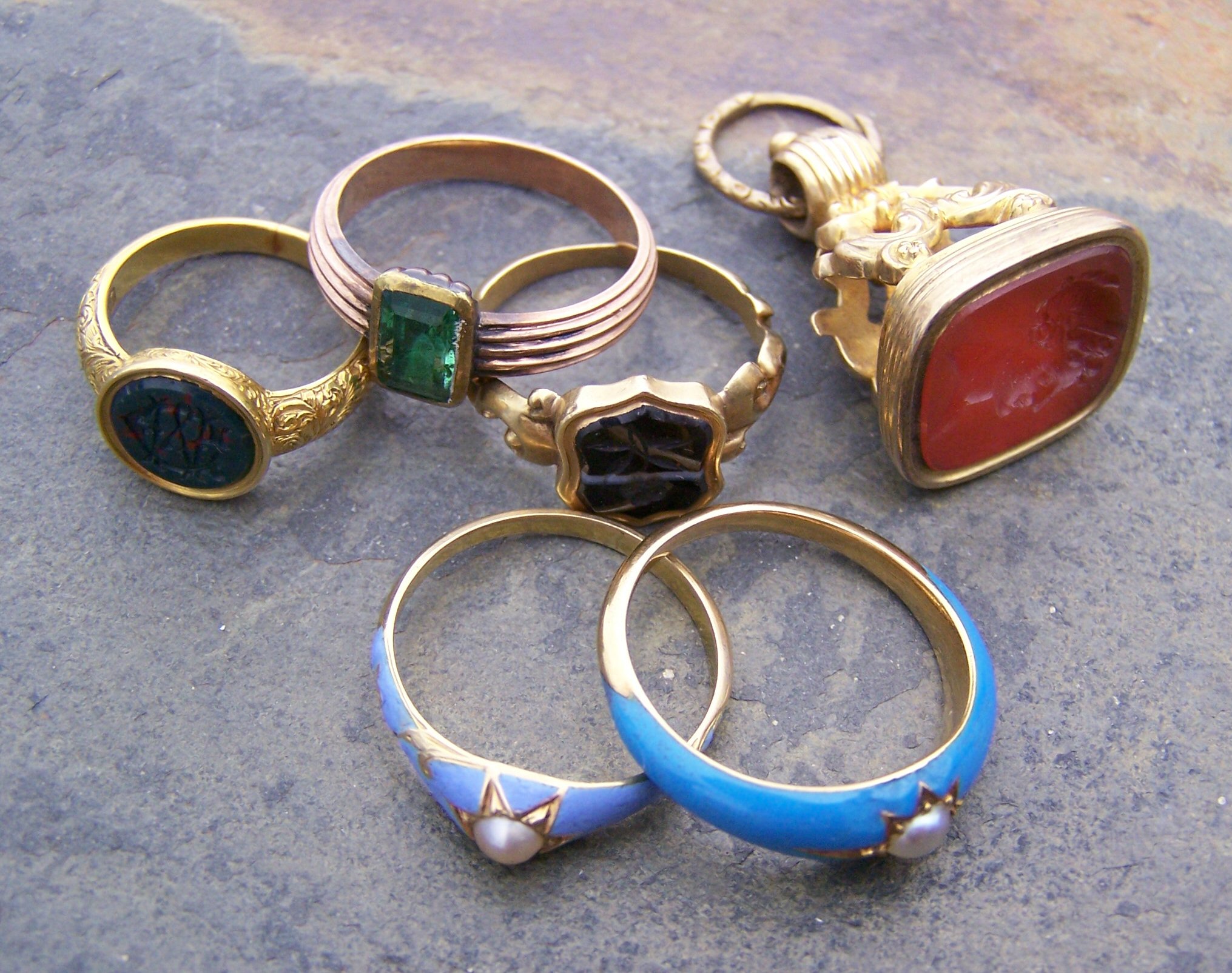of rounded rectangular form set with a cornelian intaglio carved with a female portrait profile; a signet ring set with a circular monogrammed bloodstone panel between foliate scroll decorated shoulders; another signet ring set with a shield shaped onyx panel engraved with a floral intaglio; two pale blue enamelled half-pearl set rings; together with another ring, collet set with a trap cut emerald with closed back setting (5)