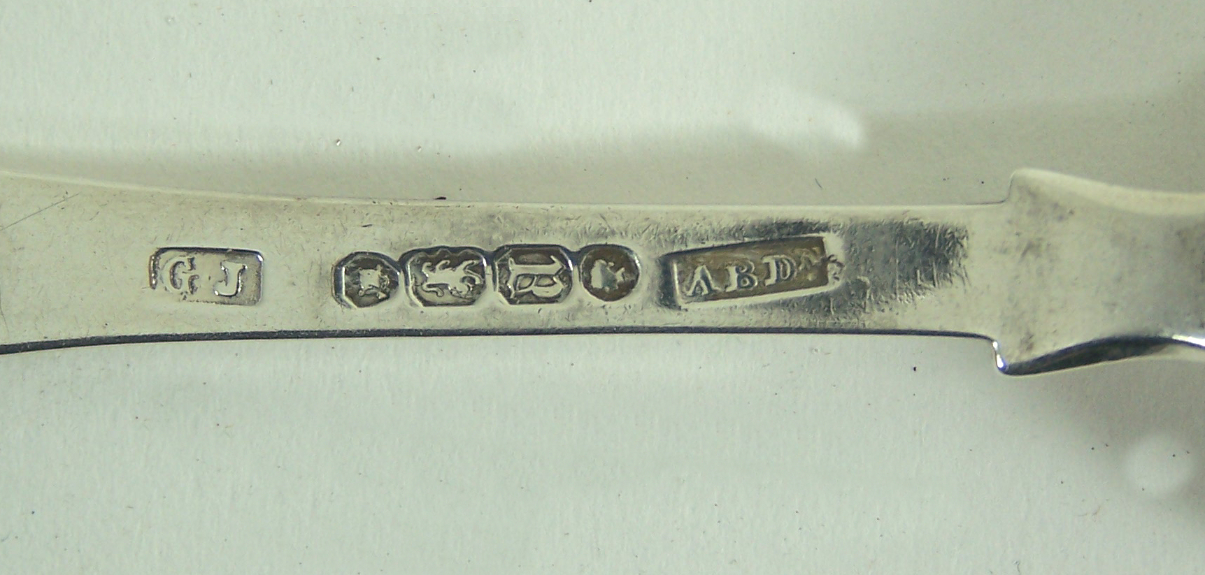 with marks for London 1852, by George Jamieson; together with a composite set of six King's pattern teaspoons, Edinburgh 1831 and 1832, marked GB (probably by George Booth of Aberdeen), all with matching initials; a pair of Old English pattern table spoons, Edinburgh 1794, by Graham and Maclean; a Fiddle pattern table spoon, Edinburgh 1822, maker's mark A W and retailed by Morton (15)