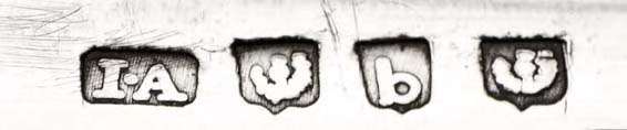 No known maker's mark for John Argo has a dot between the initials, as is clearly visible here. Furthermore, the maker I.A is thought to be one of a group of makers using these punches, all of which are untraced. Additionally, the lower case b and thistle punches very closely resemble those used in the cycle of hallmarks denoting Edinburgh 1807-1808.