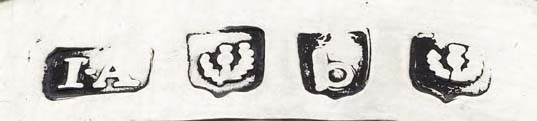The series of marks: I.A., thistle, b, thistle, struck to this lot and the following lot, has for some time been attributed to John Argo of Banff. However, it is now felt that this is not the case and that the lower case b does not signify a Banff town mark but a pseudo date letter for Edinburgh 1807-1808.