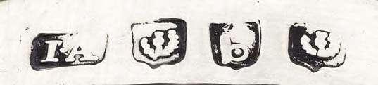 No known maker's mark for John Argo has a dot between the initials, as is clearly visible here. Furthermore, the maker I.A is thought to be one of a group of makers using these punches, all of which are untraced. Additionally, the lower case b and thistle punches very closely resemble those used in the cycle of hallmarks denoting Edinburgh 1807-1808.