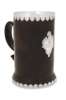 with marks for Edinburgh 1767, maker Ker & Dempster, of cylindrical form slightly flared towards the base, silver lined with scalloped edges to the rim and foot mounts, the S-scroll handle with mounted heart-shaped kick, the body applied to the front with a Rococo cartouche with C-scroll engraved border, surmounted by a shell and scrolling banners inscribed ESSE QUAM VIDERI above a crest and the inscription: TYNE SILLER, TYNE LITTLE, TYNE FRIENDS TYNE MICKLE, TYNE HEART TYNE A'