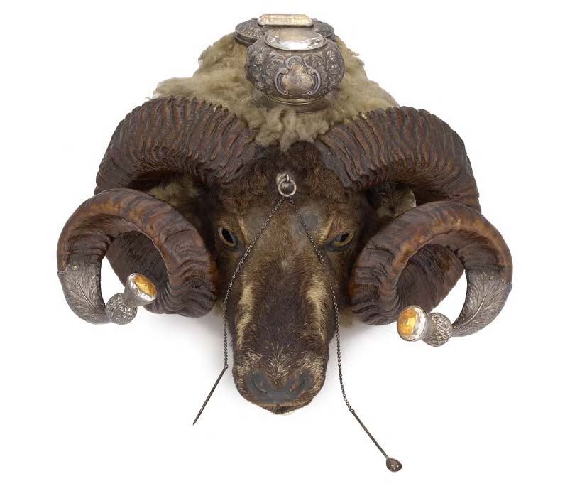 with marks for Edinburgh 1867, maker probably J Crichton, a full-head example with two lidded compartments to the head, each set with foil backed cairngorms and embossed thistle design, with gilt interior, the larger compartment for snuff, the smaller with spaces for cigars, with matching mounts and cairngorm set thistles to the tips of horns, all on three ceramic castors and with snuff spoon and pricker attached by chain