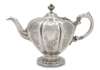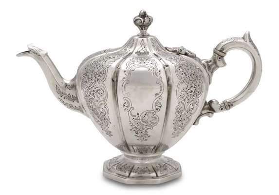 with marks for Edinburgh 1846-7, maker William Marshall, of inverted pear shape with panelled sides, scroll handle and spout, engraved with foliate and scroll work detail, with two blank cartouches