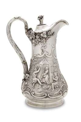 with marks for Glasgow 1852, maker J & W Mitchell, of baluster form, the domed lid cast with a crest of a hand holding a baton, the handle of naturalistic form with applied vine leaf and grape detail, the body decorated with Scottish figures dancing in landscape settings, on stepped circular foot