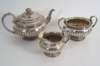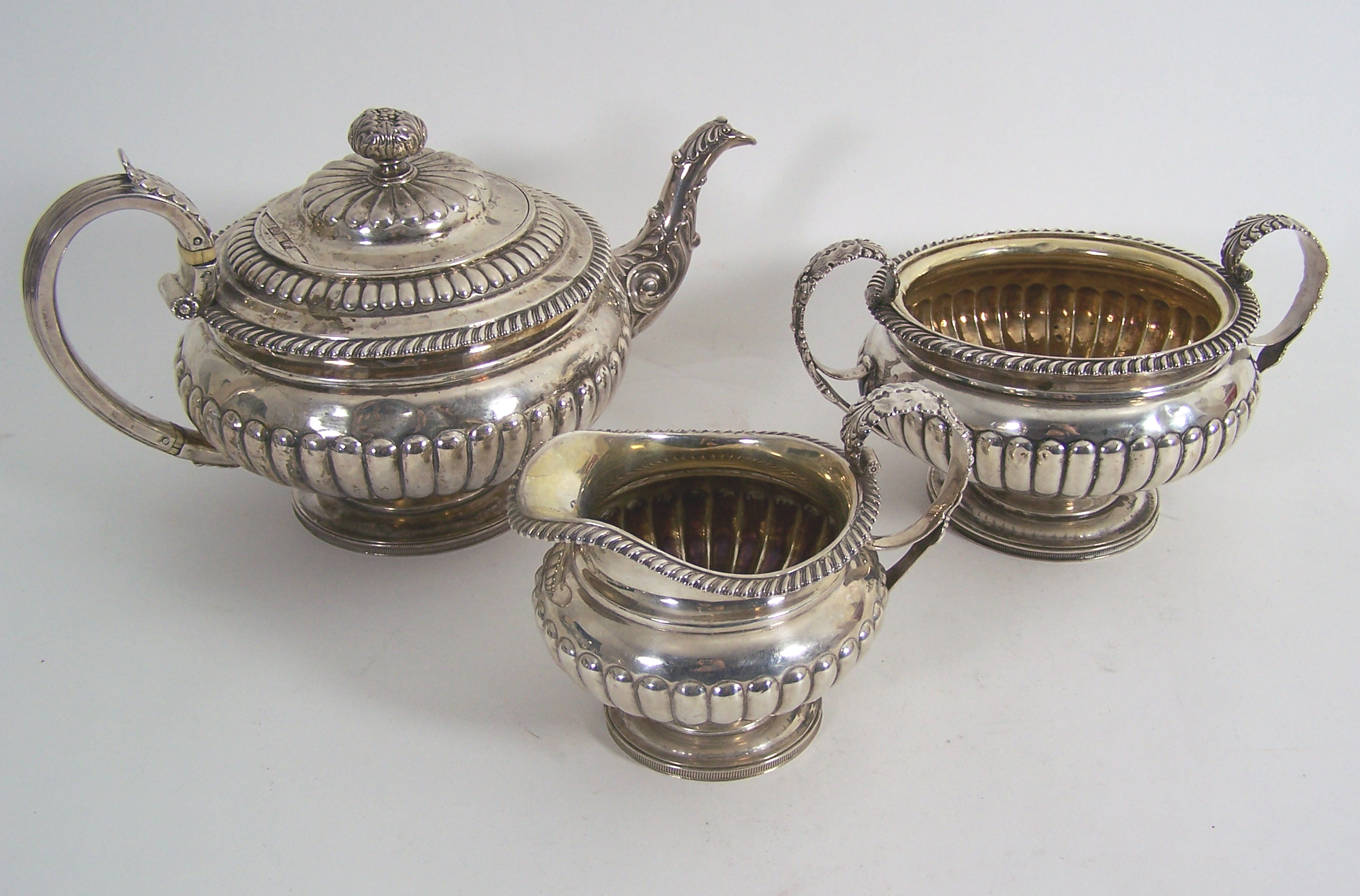 with marks for Edinburgh 1821, maker George McHattie, comprising teapot, sugar bowl and milk jug, each of squat circular form, semi-fluted, with gadrooned border and acanthus clasped handles, on stepped circular pedestal foot (3)