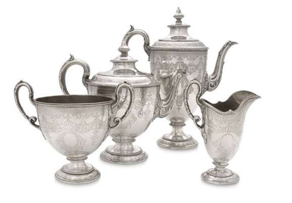 with marks for London 1868, maker Edward Barnard & Sons Ltd, comprising teapot, coffee pot, twin-handled sugar bowl and cream jug, each of circular outline, on pedestal foot with bead borders, engraved with foliate swags, bow-tied ribbons, scrolls and vacant oval cartouches, contained in a fitted wooden case stamped Widdowson & Veale