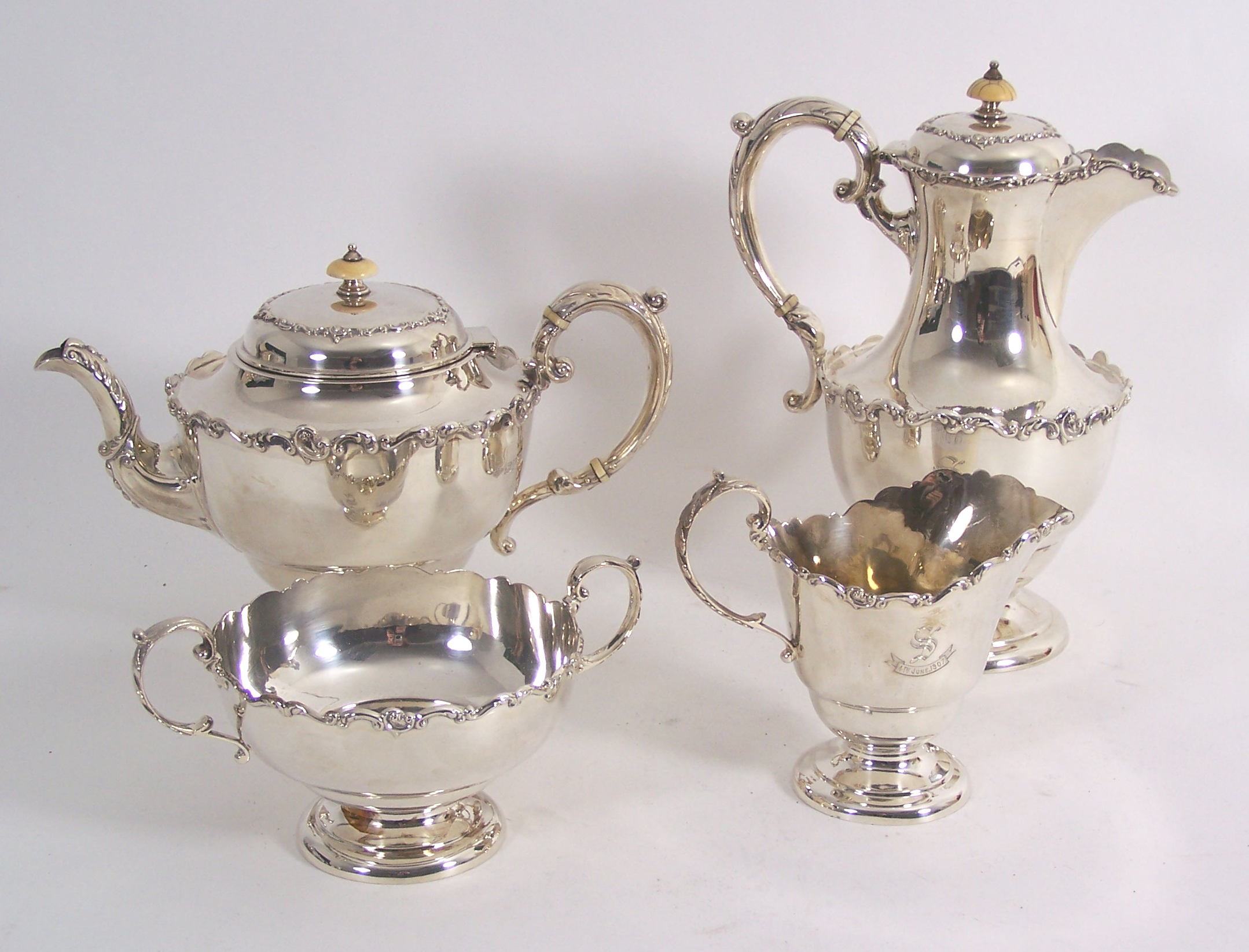 with marks for London 1905, maker Horace Woodward & Co. Ltd, comprising teapot, hot water pot, twin-handled sugar bowl and milk jug, each of circular outline, with scroll cast edge on pedestal foot, with leaf capped scroll handle, initialled and dated