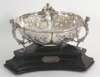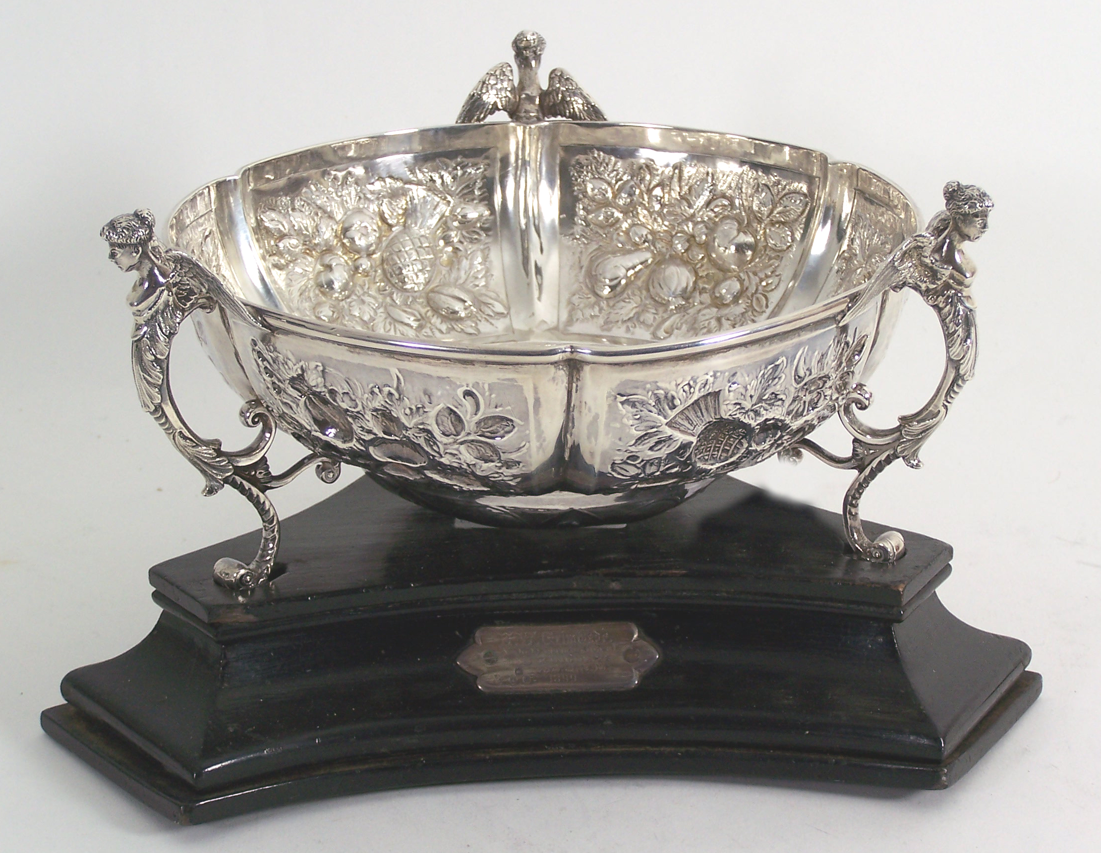 with marks for London 1895, maker John Newton Mappin, of lobed form, embossed with fruits and foliage around the central spiral engraved circular panel, raised on three scroll supports surmounted by cast winged females, with triform ebonised wooden base, applied with a plaque, London 1903, inscribed E.W. GRIMWADE, A SLIGHT APPRECIATION OF HIS KINDNESS, FROM J.N.M., 1899