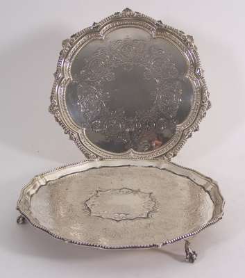 with marks for London 1776, maker Robert Jones (I) and John Scofield, of shaped circular form raised on three claw and ball cast feet, with bead and shell cast edge and foliate scroll engraved border (A/F); together with another similar salver, Sheffield 1913 (2)
