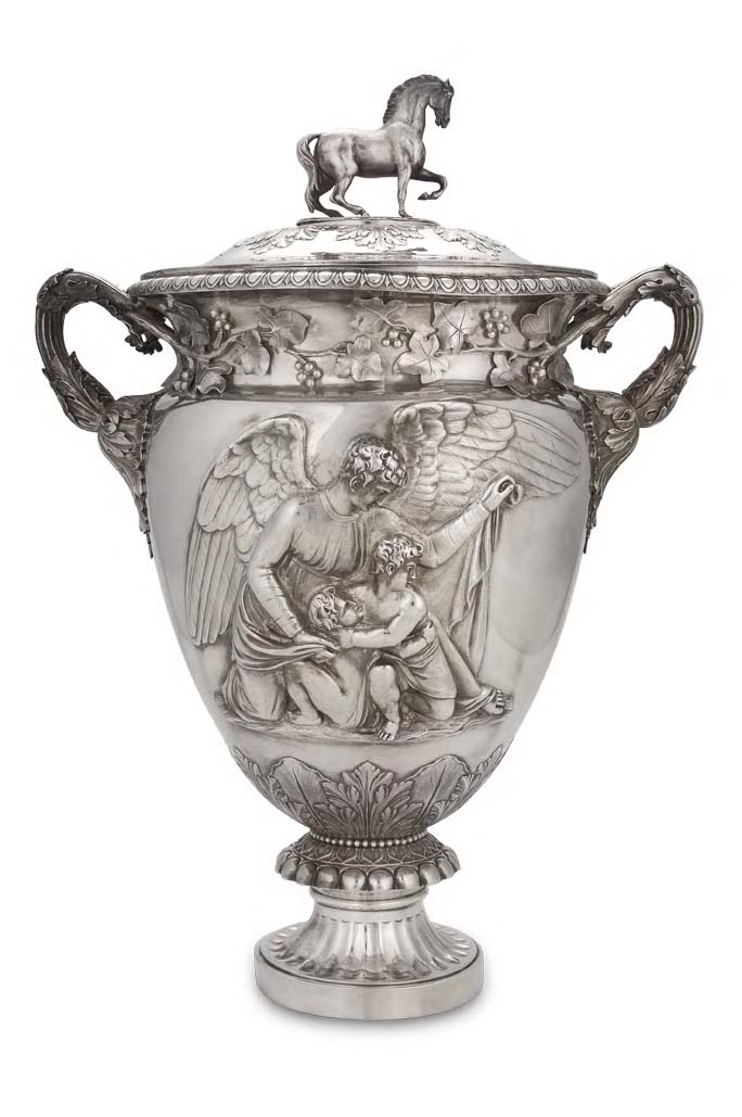 with marks for London 1827, maker John Bridge, the slightly domed lid with horse cast finial, with acanthus clasped border, the vase shaped body with egg and dart border and applied frieze of vine leaves and grapes, flanked by two leaf clasped bifurcated handles, one side with repousse detail of a winged angel and two figures, the other with applied armorial and motto I AM READY, with leaf clasped stepped base, with beaded border and fluted detail, the cover, finial and body all marked