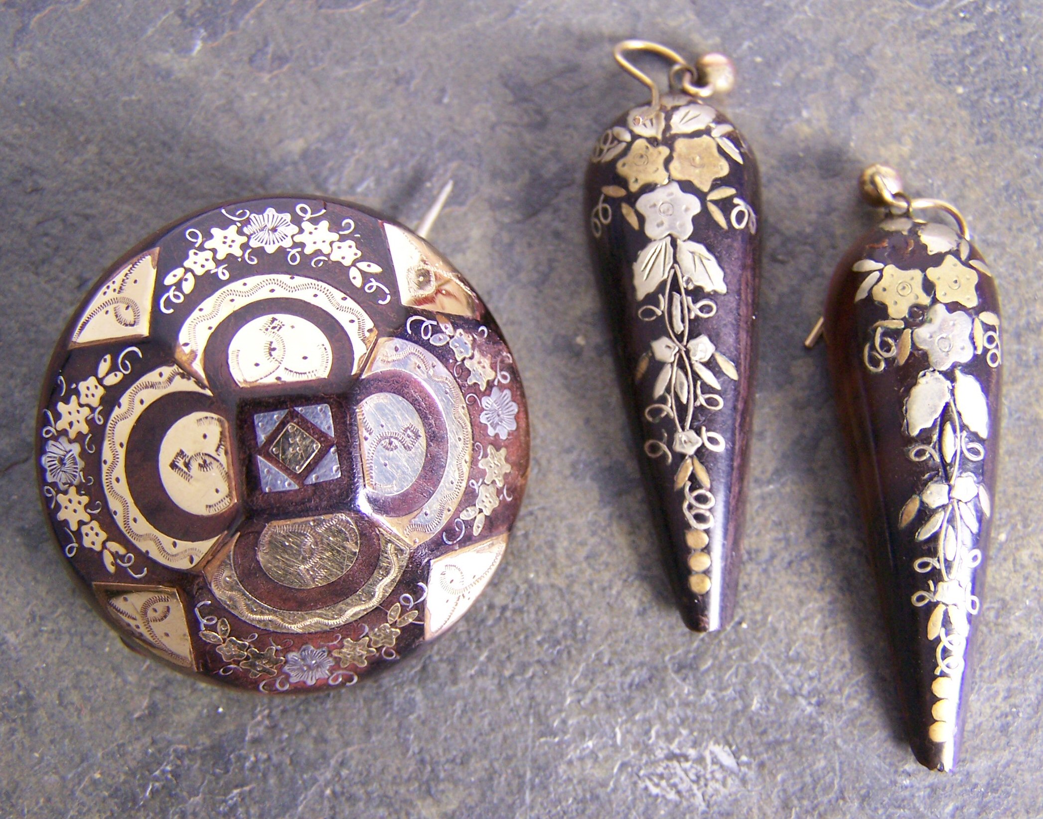comprising a domed circular brooch and a pair of pendant earrings of tapering outline, each decorated with floral and foliate scrolls