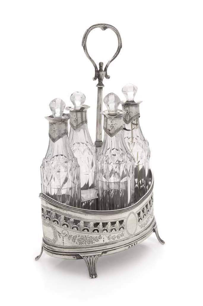 with marks for London 1792, maker Peter and Anne Bateman, of oval form, the whole with bright cut engraved decoration with pierced detail, tall handle and wooden base, the faceted glass bottles with engraved silver collars and glass stoppers