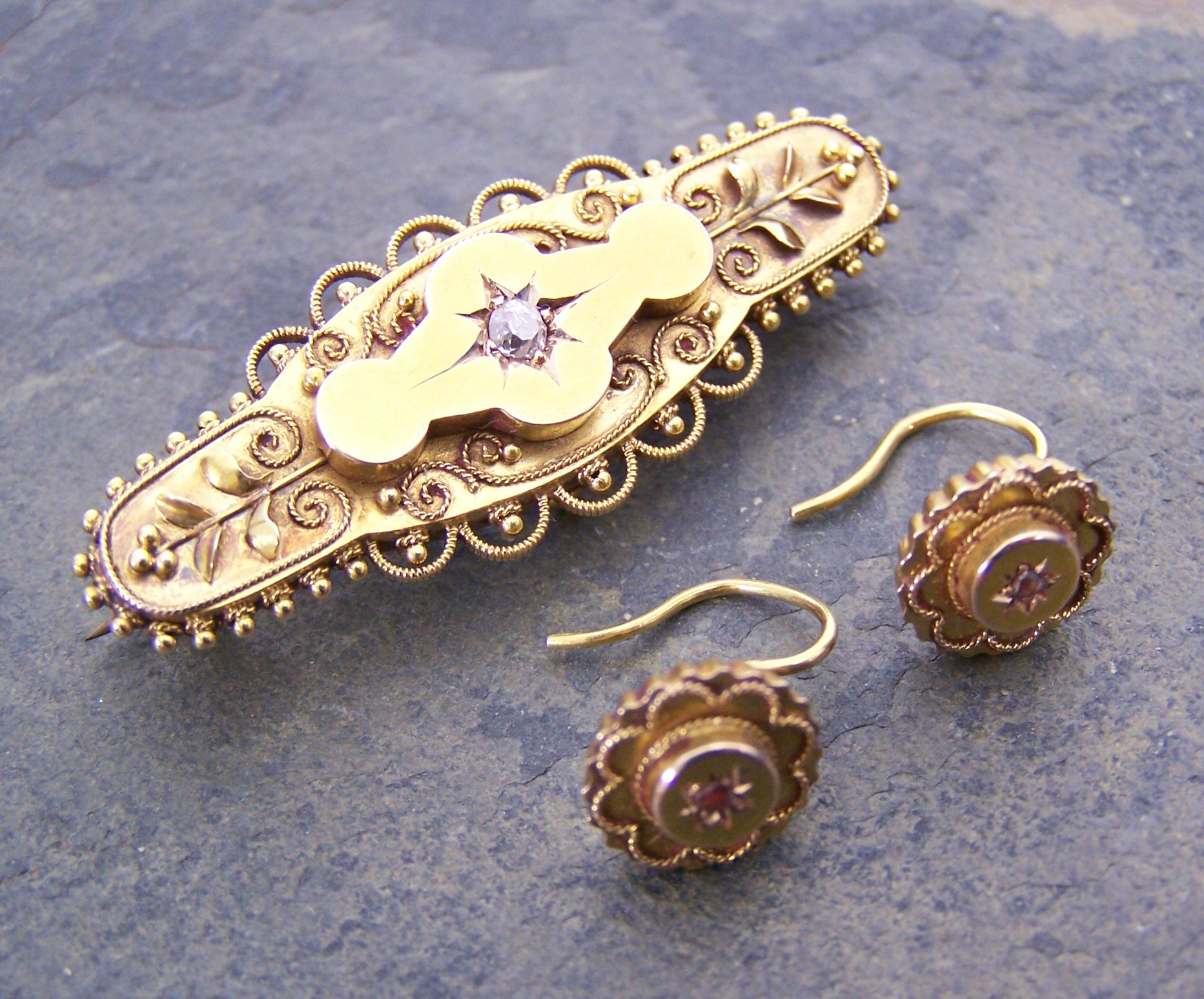comprising a shaped oval bar brooch decorated with cannetille work and star set to the centre with an old European cut diamond together with a pair of similarly decorated circular pendant earrings each star set with a rose cut diamond, contained in a fitted case