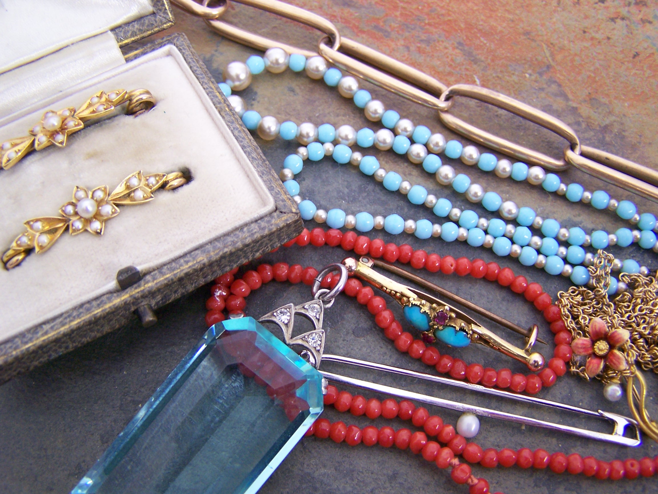to include a gold fetter link Albert chain; a large paste pendant; a cased pair of seed pearl set bar brooches; an enamel and seed pearl set floral brooch; a 9ct gold heart pendant with chain; a 9ct white gold seed pearl set bar brooch; another gem set bar brooch; a 9ct gold plain bar brooch; a coral bead necklace and another bead necklace with matching bracelet (11)