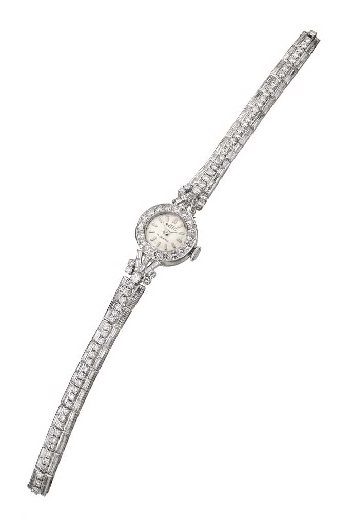 the champagne circular dial with gilt baton numerals and hands, with round brilliant cut diamond set bezel, trifurcated shoulders channel set with baguette cut diamonds and integral bracelet, claw set to the centre with a line of round brilliant cut diamonds, flanked by borders of baguette cut diamonds