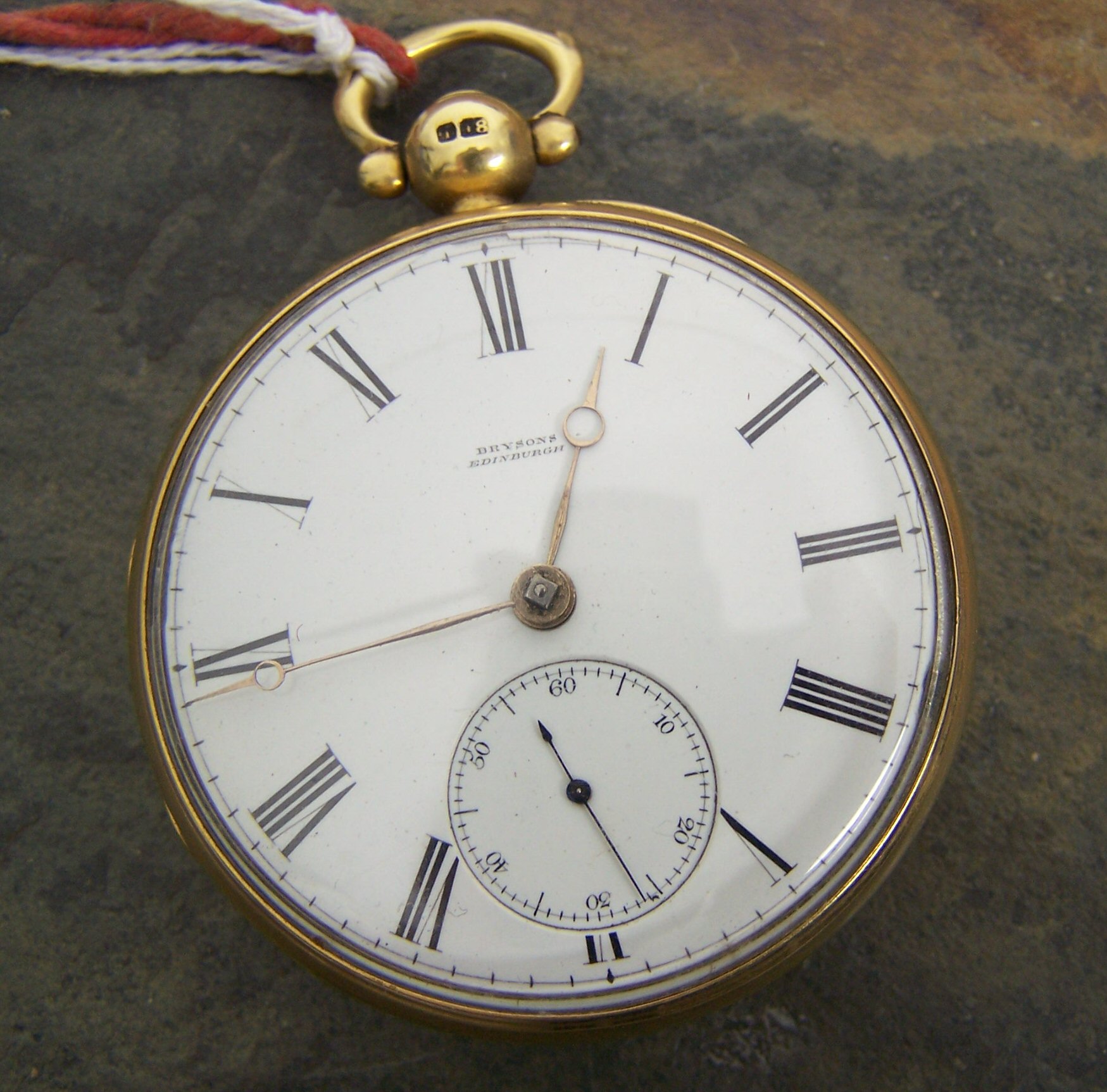 the white enamel dial with black roman numerals and gilt hands, with subsidiary seconds dial with arabic numerals and key wound movement signed R Bryson & Sons, Edinburgh, no. 4025, case engine turned to reverse