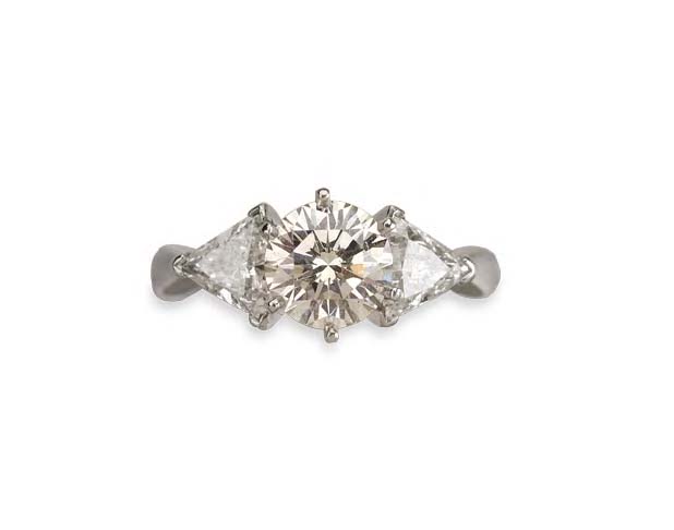 the central claw set round brilliant cut diamond flanked to either side by a fancy triangular cut diamond