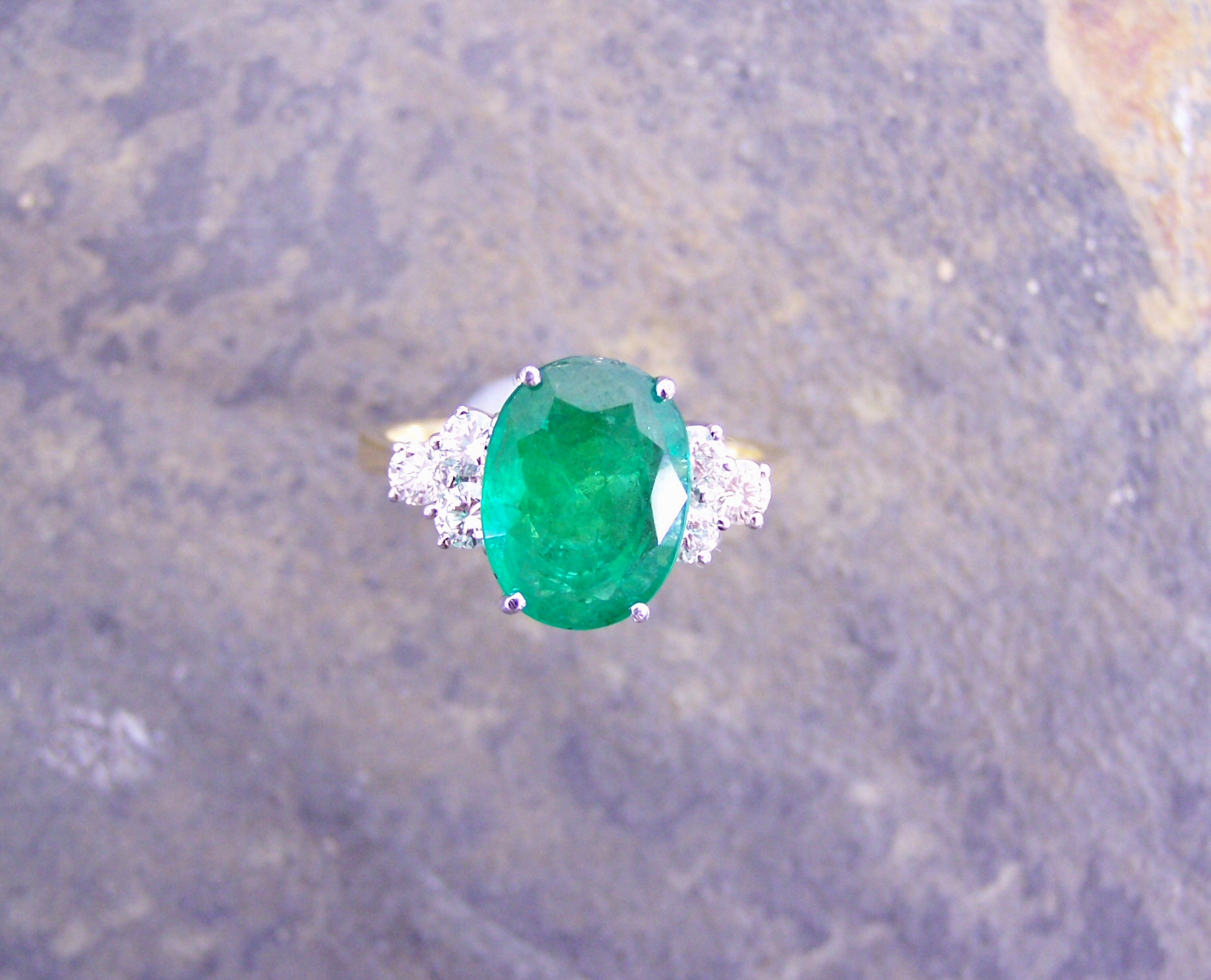 the central claw set oval cut emerald flanked to either side by a triangular cluster of three round brilliant cut diamonds