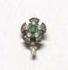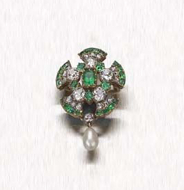 of shaped circular outline, designed as a stylised five-pointed cross, claw set to the centre with a trap cut emerald within a circular border, alternately set with old European cut diamonds and square trap cut emeralds, within outer borders of rose cut diamonds and graduated trap cut emeralds, suspending an old European cut diamond surmounted ovoid pearl drop