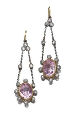A pair of pink topaz and rose cut diamond pendant earrings,