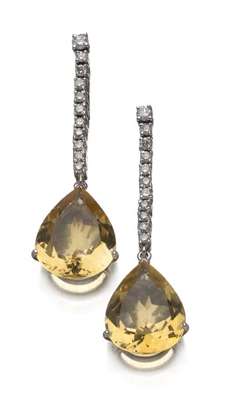 A pair of citrine and diamond pendant earrings,