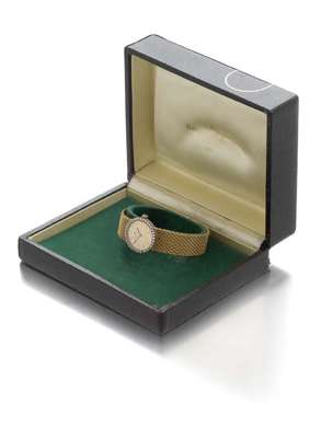 the satin finished gold circular dial with baton numerals, with single cut diamond set bezel, to a tapered interwoven bracelet, with box