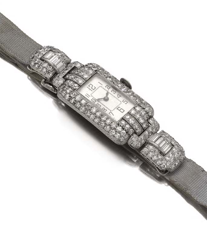 the cream rectangular dial with black Arabic numerals and hands within a rounded rectangular surround pave set with single cut diamonds, the similarly set shoulders also channel set with a border of baguette cut diamonds, to a pale grey ribbon strap, mounts stamped 18ct