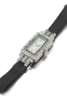 the champagne coloured rectangular dial with arabic numerals, within a millegrain set border of calibre cut emeralds and an outer border of single cut diamonds, with similarly set shoulders to a black moire ribbon strap