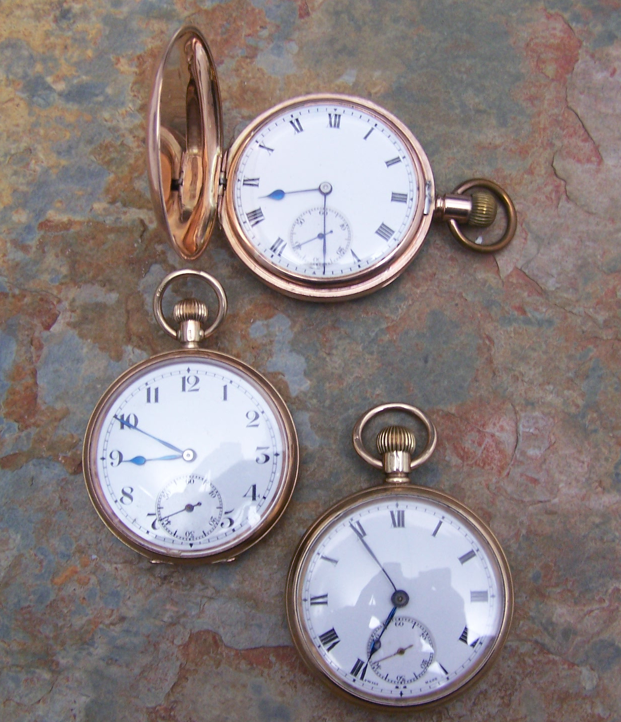 keyless wind and in full hunting cases, plain dial; together with another two 9ct gold cased pocket watches, keyless wind, plain dial (3)