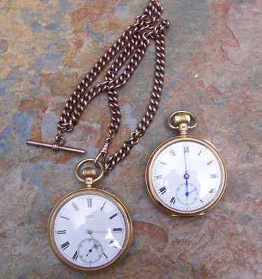 the plain circular dial numbered 29282, with subsidiary seconds dial and plain lever movement; together with another 18ct gold pocket watch, key wind, open faced, gilt dial with subsidiary seconds dial, with foliate engraved case (2)