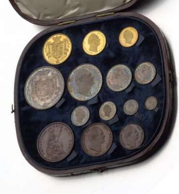in contemporary maroon leather fitted case, comprising coins issued from two pounds down to maundy penny
